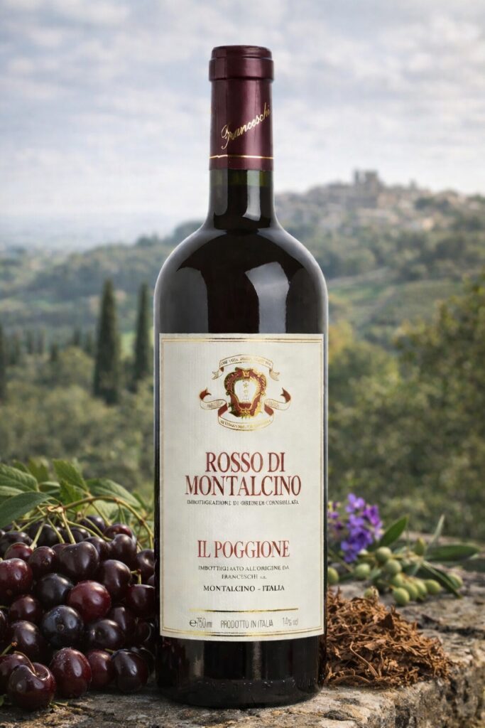 Nel calice il Rosso di Montalcino Il Poggione si presenta con un colore rosso rubino vivace e brillante. Al naso รจ fruttato e invitante, con profumi di ciliegia, frutti di bosco, viola e delicate note speziate che si sviluppano gradualmente. Al palato รจ di media struttura, con tannini presenti ma giร ben levigati dall’affinamento in legno, una freschezza vivace e un finale pulito e persistente. Un vino che coniuga immediatezza e complessitร in modo sorprendente per la sua categoria.
