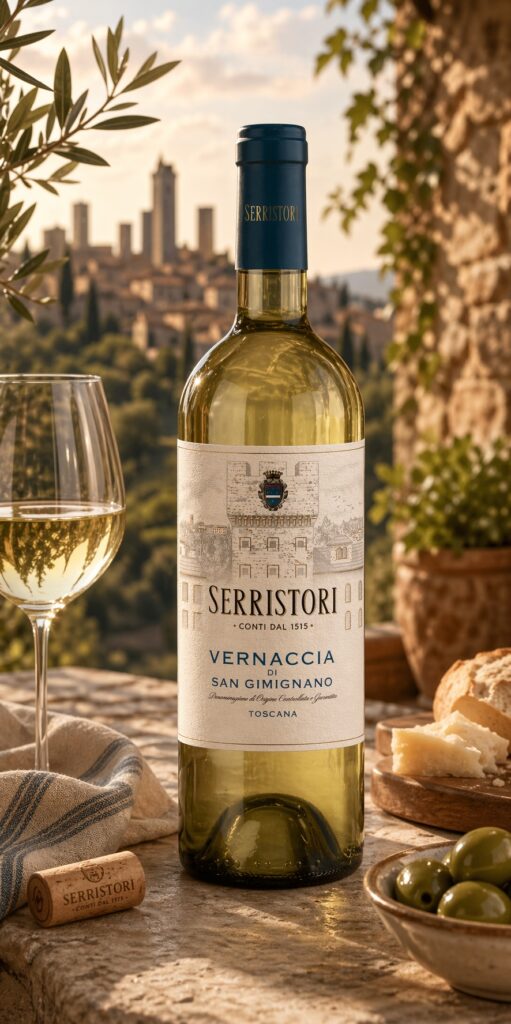 La Vernaccia di San Gimignano Serristori Γ¨ un vino bianco toscano che incarna l’eleganza e la tradizione di una delle denominazioni piΓΉ antiche d’Italia. Prodotta dalla storica cantina Conti Serristori, con sede a Poggibonsi nel cuore della Toscana, questa Vernaccia nasce nei vigneti collinari che circondano le celebri torri medievali di San Gimignano. La famiglia Serristori, protagonista del Rinascimento fiorentino fin dal XIII secolo, porta nel bicchiere secoli di cultura viticola e un profondo legame con il territorio toscano.